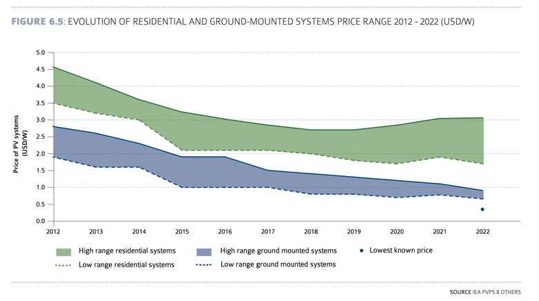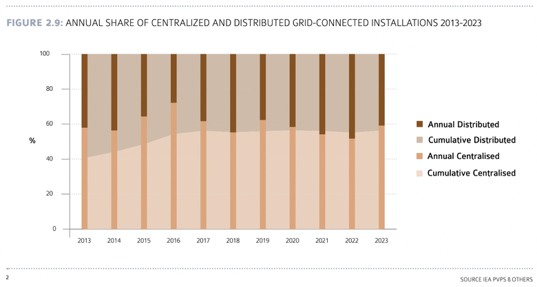 Les grandes installations au sol ("Grid-connected centralized") représentent 60 % du volume installé dans le monde en 2023. Les autres installations ("Grid-connected distributed") sont pour l'essentiel des systèmes en toiture.